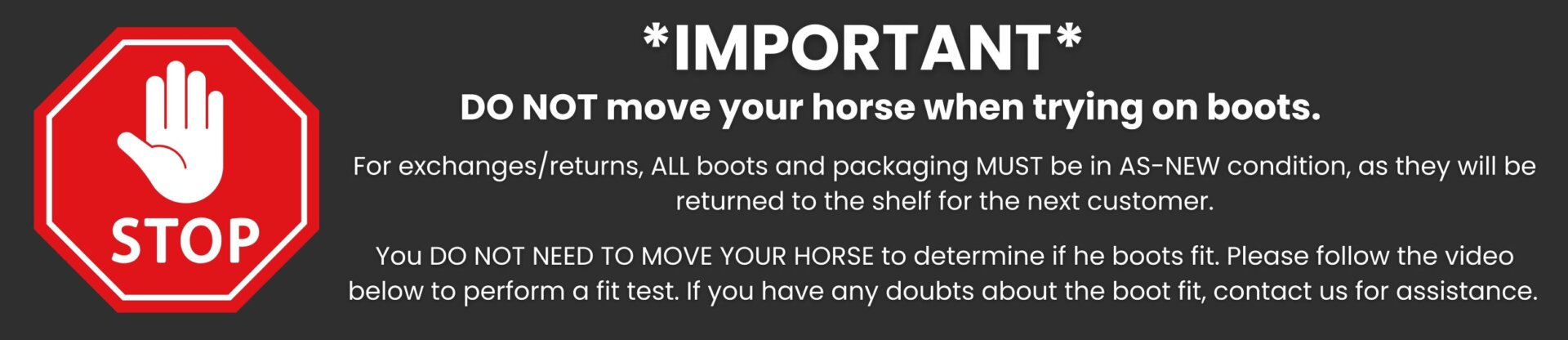 Only new, UNUSED boots can be exchanged. To keep the boot clean, we suggest covering the hoof with thin plastic and checking the fit on a non-scuff (not gravel), clean, dry surface.