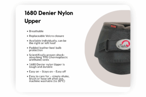 Great results are obtained with Cavallos over metal, as the TPU (thermoplastic urethane) sole absorbs the shock, which causes vibration up the horse’s structure. Cavallos also prevent sole tenderness, heel bruising, pulling shoes off and injuries to the coronet band and other areas. Boots are also used for shod horses for hoof rehabilitation and to provide increased comfort and protection during riding, training, transport, and turnout.