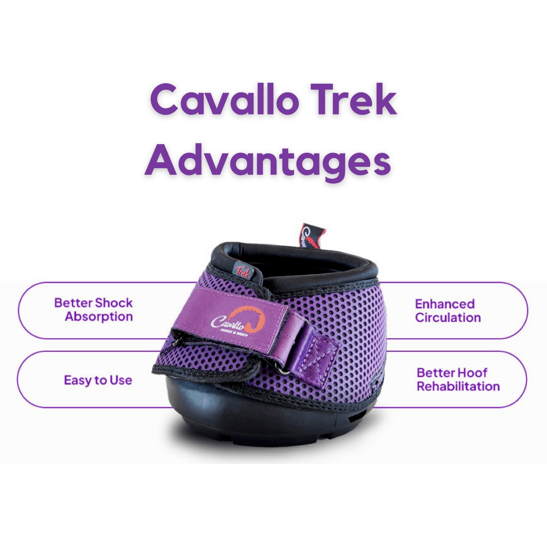 The Cavallo Trek Hoof Boot in Purple is the top choice for both riding and hoof rehabilitation. It supports your horse while recovering from laminitis, navicular, abscesses, sole bruising, hoof cracks, punctures, contracted heels, and more. Trek is also ideal for horses with chronic pain or hoof sensitivity, and can be used for transport and trailering. Whether your horse is on the trail, in turnout, or being transported, the Cavallo Trek offers complete hoof protection and all-day comfort.